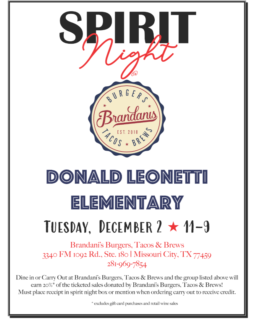 Join us for lunch or dinner during Leonetti's Spirit Night at Brandanis Burgers, Tacos & Brews on Tuesday, December 2 from 11 a.m. to 9 p.m.! Whether you dine in or carryout, 20% of the sales will be donated to DLE! Place your receipt in the spirit night box or mention DLE when ordering carry out.