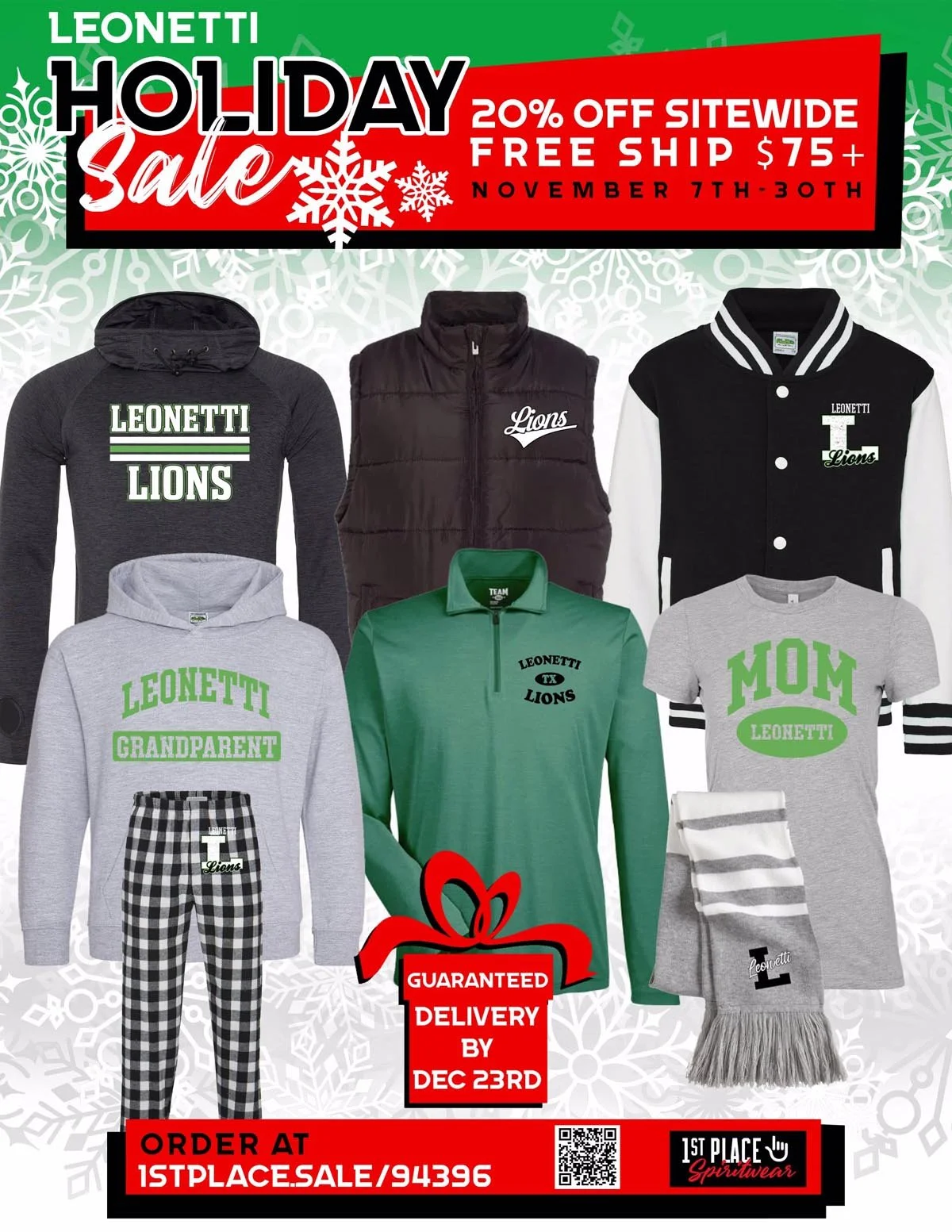 The Leonetti Elementary School holiday sale is on! Choose from hundreds of designs and garments, including a new line of gifts for parents, grandparents, and relatives!